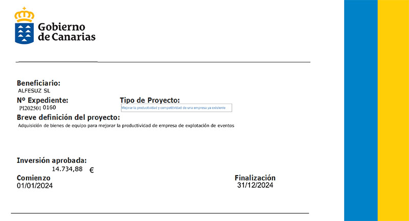 - Línea 2: Mejora de la productividad y la competitividad, ADQUISICIÓN DE CÁMARAS FOTOGRÁFICAS, OBJETIVOS Y DRON PARA LA FILMACIÓN DE EVENTOS Y OTROS SERVICIOS.